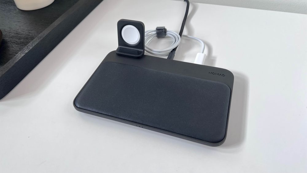 You can opt to use the new Base Station Hub with Nomad’s aluminum Apple Watch Mount (sold separately) or without. If you want to prioritize charging two iPhones wirelessly, you’ll want to skip it. If you’re okay keeping one spot for MagSafe compatible charging for iPhone, one for AirPods, and using the USB-C and USB-A port on the rear for additional smartphones, it works well to mount the Apple Watch charger adapter.