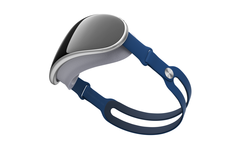 You can see how the strap resembles the Apple Watch Sport band and has both a circular metal clasp and a loop for security. The headset itself looks like it would be made out of the same silver aluminum as AirPods Max and features a mesh pad that would sit around the users’ eyes. On the front of the headset is a smooth curved glass panel.