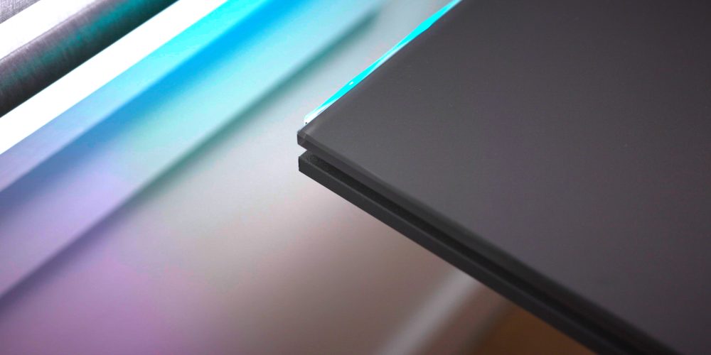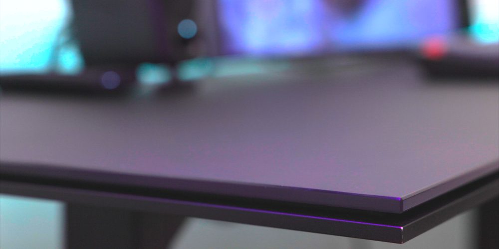 The desktop surface of the BDI Stance is made from satin-etched tempered glass, which lends it a frosted matte black look. The desktop surface feels soft and cool to the touch, but you’ll need to wipe it down daily to remove things like fingernail marks and smudges. The tempered glass is tough, but it can be scratched if you’re not careful — I have several nicks already to prove it. After this post went live, BDI shared with me an easy buffing treatment to remove scratches, and I plan on trying that soon. The remainder of the desk is comprised of powder-coated steel, which complements the desktop surface.