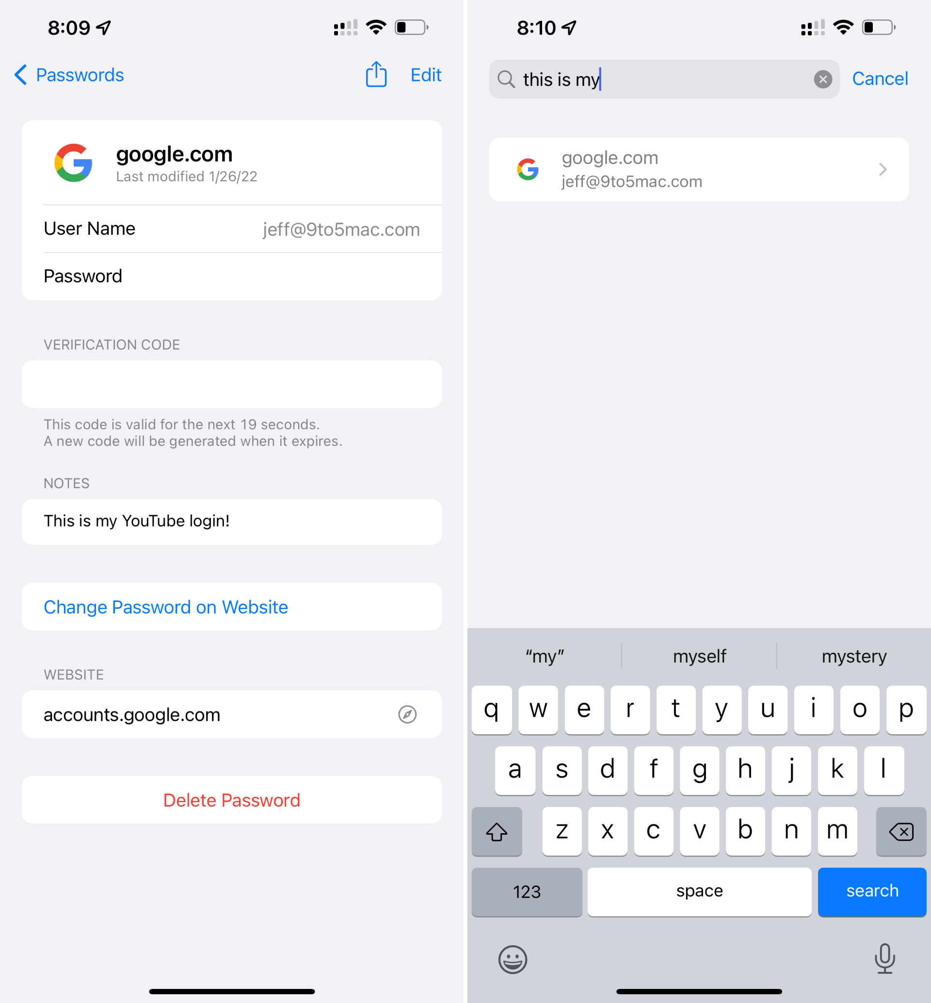 After adding the ability to support two-factor authentication in iOS 15, Apple continues to build on keychain features. When you go to Settings → Passwords in iOS 15.4 beta 1, you’ll find a new feature to add notes to keychain passwords. Not only can you add notes, but the notes strings are searchable using the search box.