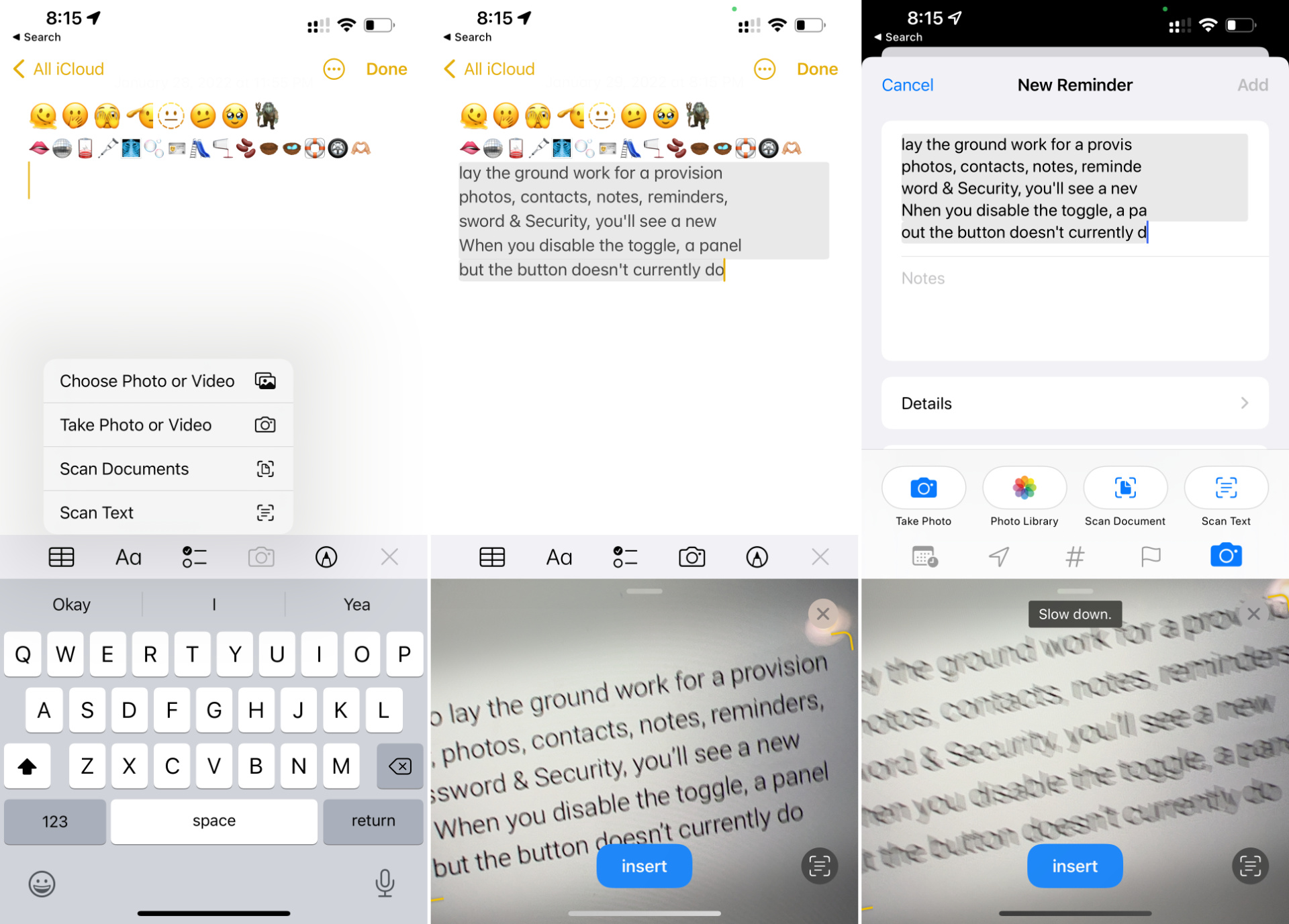 A new Scan Text option appears directly in the Notes and Reminders app, allowing you to quickly add text directly from an image to a note or reminder.