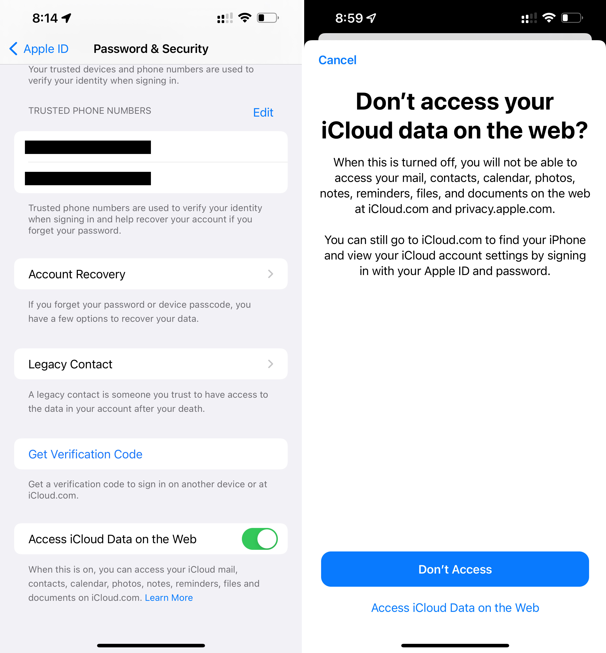 Although it doesn’t appear fully operational, Apple has started to lay the groundwork for a provision that will let users disable iCloud.com access for mail, calendar, photos, contacts, notes, reminders, files, and documents. When you visit Settings → iCloud → Password & Security, you’ll see a new Access iCloud Data on Web toggle at the bottom of the page. When you disable the toggle, a panel appears with a Don’t Access button to confirm your decision, but the button doesn’t currently do anything.