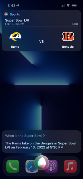 Something else we can all agree on about Siri is that it’s pretty good at sports knowledge. Siri knew that the Cincinnati Bengals and Los Angeles Rams were playing in this year’s Super Bowl shortly after each NFL championship game concluded last night.