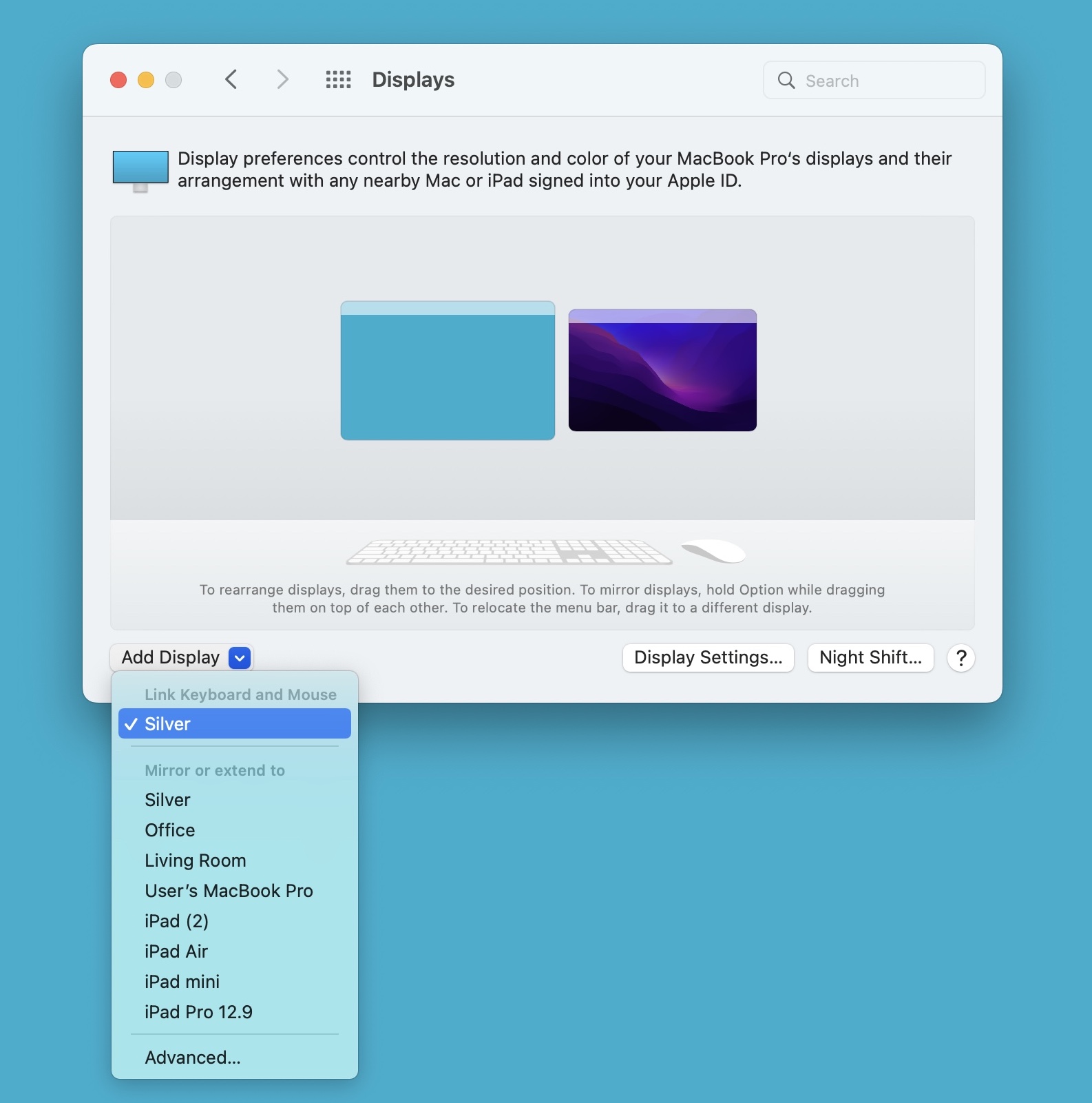 You can also invoke Universal Control directly from System Preferences → Displays. Once there, click the Add Display button in the bottom left-hand corner, and select the name of your eligible Mac or iPad under the Link Keyboard and Mouse heading.