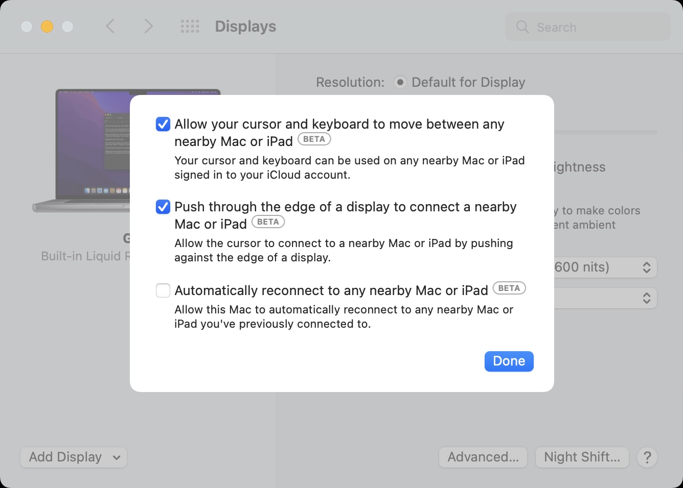 Hidden within macOS’s Display settings in System Preferences are three settings, currently in beta, directly related to Universal Control. To access these settings, click the Advanced button found in the bottom right-hand corner.