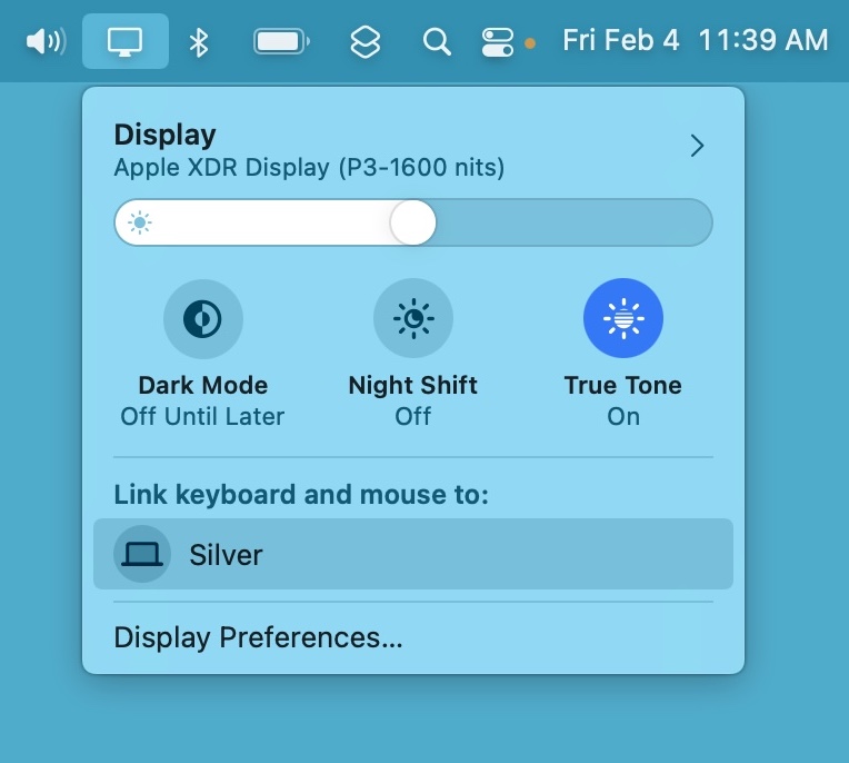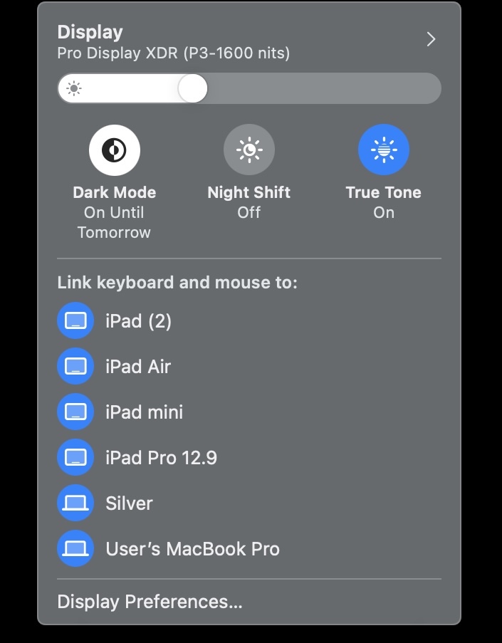 Once an instance of Universal Control is established, the Display icon will appear in the menu bar. When you click the icon you’ll see a ‘Link keyboard and mouse to:’ heading with the name of the Universal Control-eligible devices underneath. You can use this menu bar shortcut to quickly enable or disable Universal Control.
