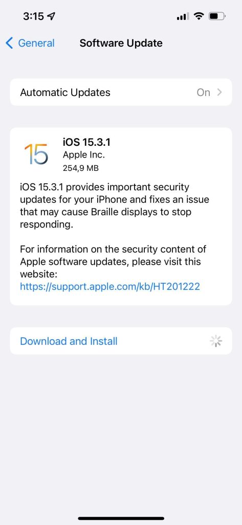 Apple’s release notes say: “iOS 15.3.1 provides important security updates for your iPhone and fixes an issue that may cause Braille displays to stop responding.”
