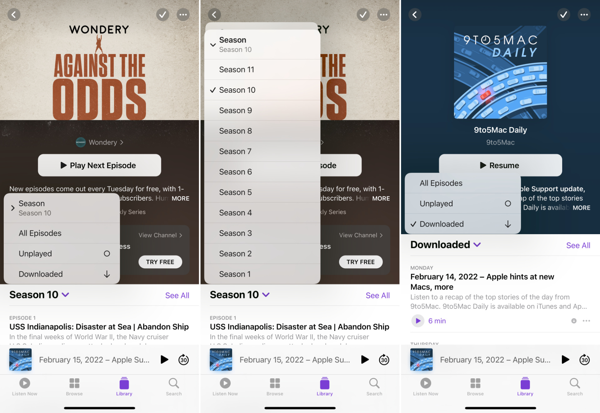 In addition to being able to filter podcasts by episodes, you can also browse individual seasons for shows shows that feature season metadata. Using the same Episodes dropdown menu on the main show page, you can quickly select between multiple seasons. Once you select a season, the Podcasts app allows you to continue to filter by episode.