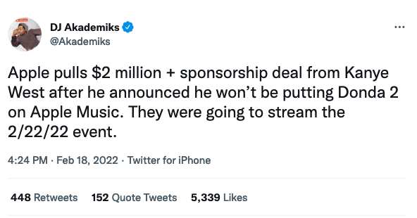 Apple ending the sponsorship, which reportedly came with a nice $2 million check, came at no surprise given West’s comments. Apple was set to stream the Donda 2 listening event hosted in Miami on February 22 (2/22/22), according to DJ Akademiks on Twitter.