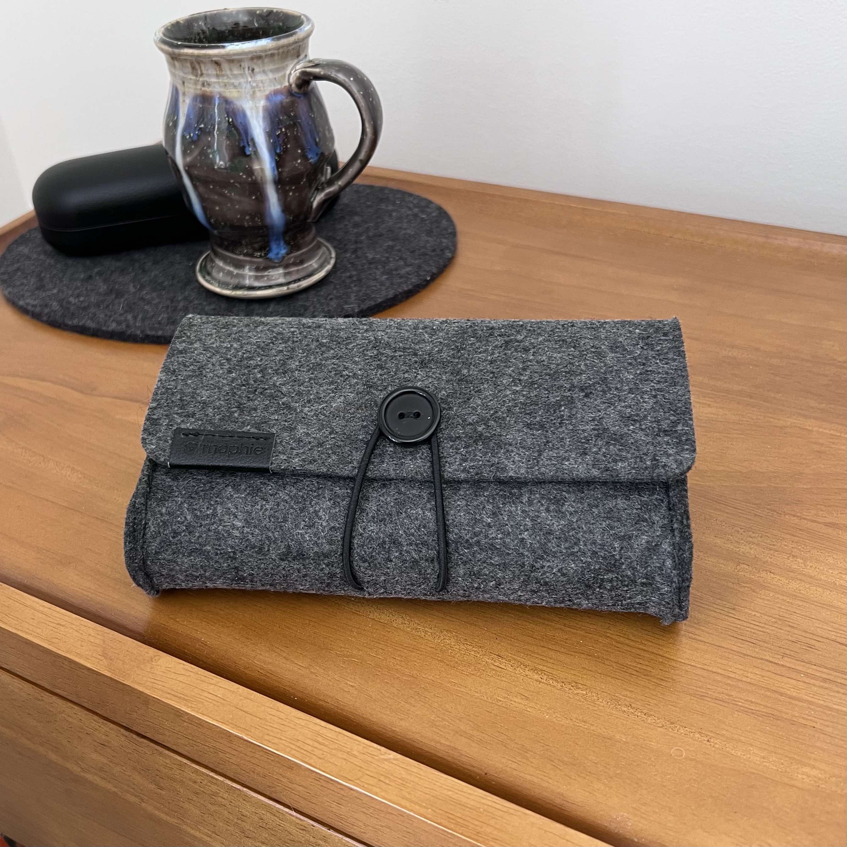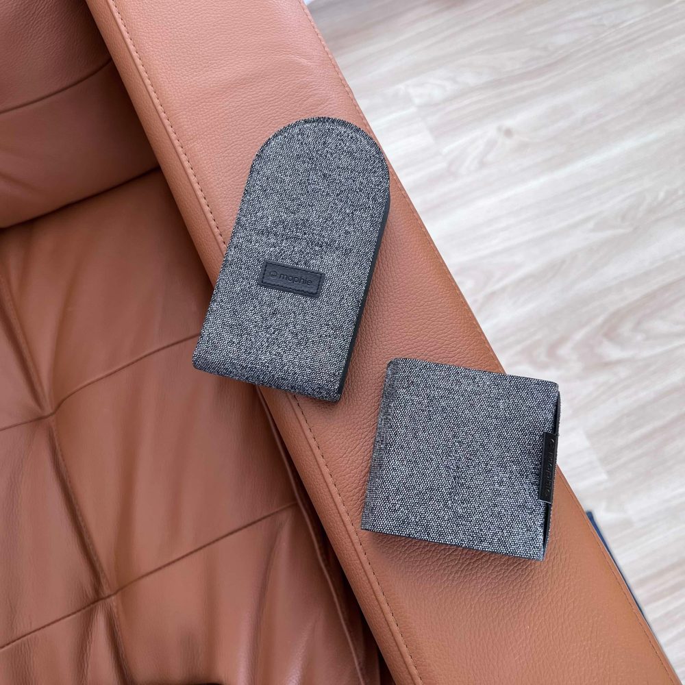 Here’s a closer look at the travel charger when folded. It features a super-soft (but durable) gray and black exterior with magnets keeping it closed when stored.