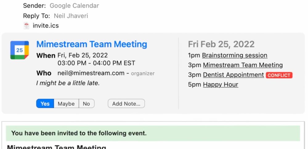 Today’s update continues to deepen the integration between Gmail features and the native macOS Mimestream application. The most notable feature is integration with Google Calendar, which allows you to accept or decline Google Calendar invites directly within Mimestream. You can also add notes to the event and view other events scheduled for that same day.
