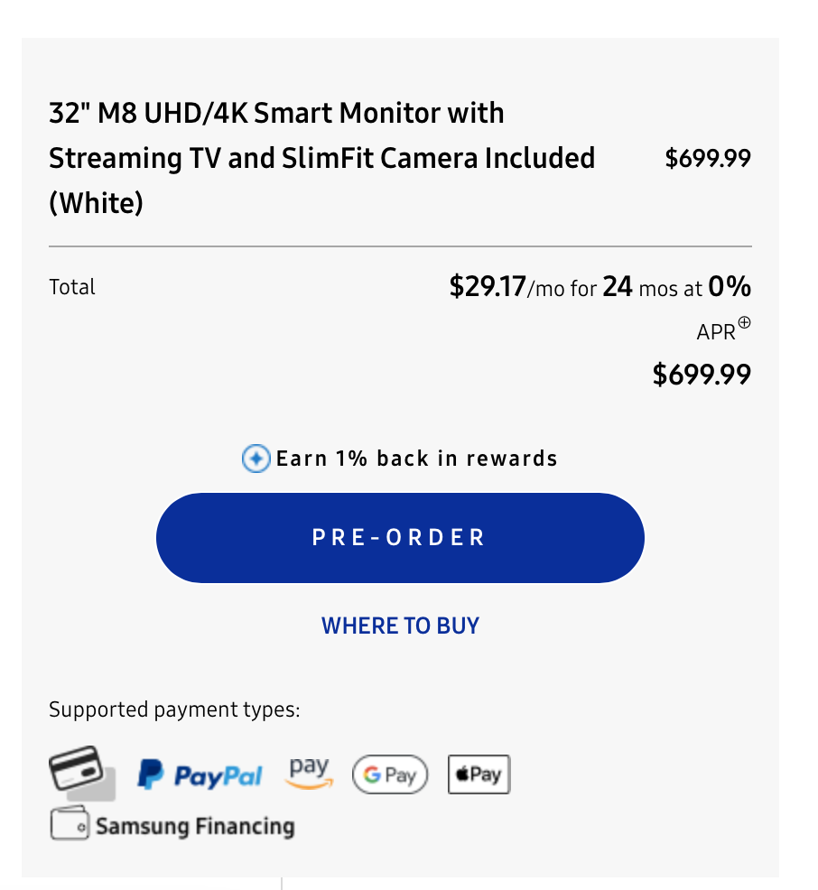 The Smart Monitor M8 is up for pre-order now direct from Samsung with the white version going for $699.99 and the colored variants selling for $729.99.
