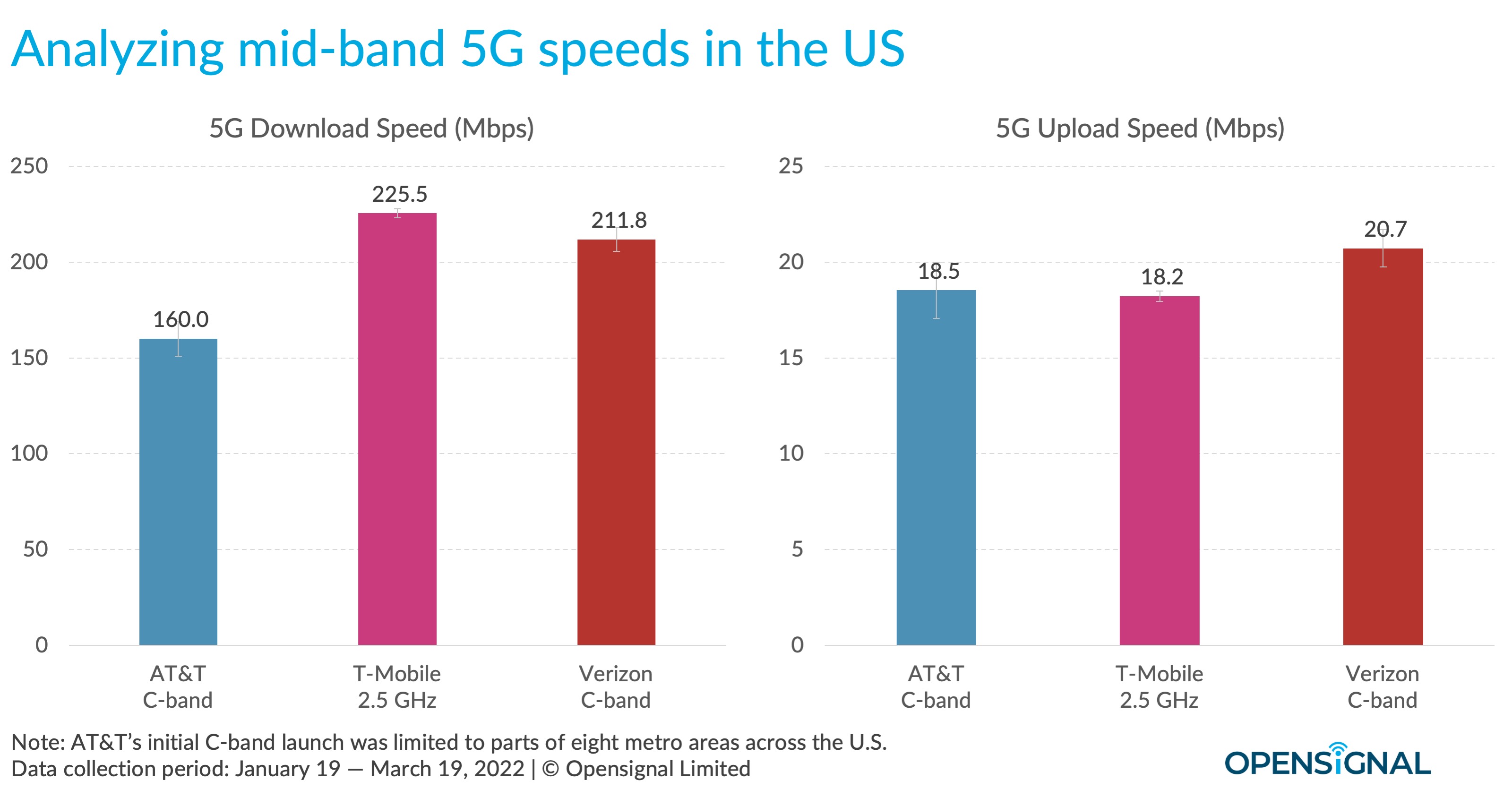 With AT&T not fully rolling out its C-band coverage yet, it’s still lagging behind with 160 Mbps mid-band 5G download speeds but is in the middle of T-Mobile and Verizon with 18.5 Mbps upload speeds.