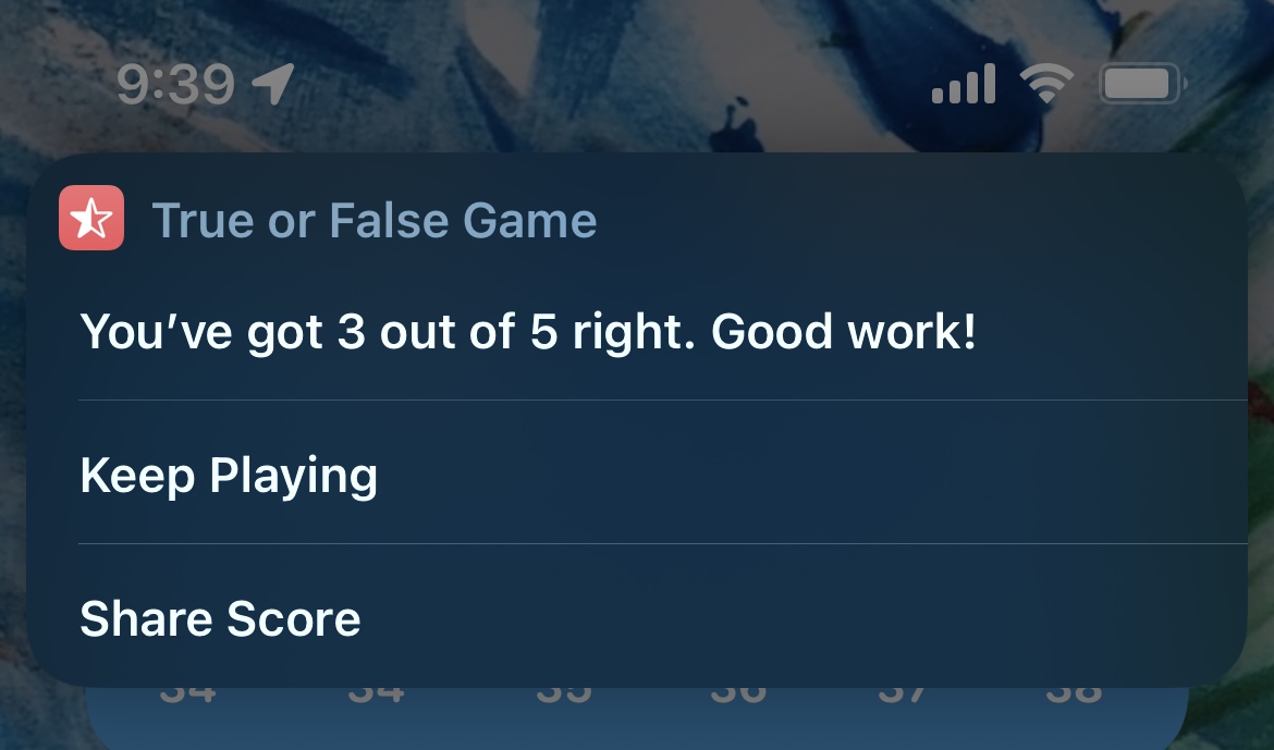 It looks like there is a good amount of tricky trivia available as when you’re done with the first five questions, Siri shows your score and asks if you want to keep playing or share your score.