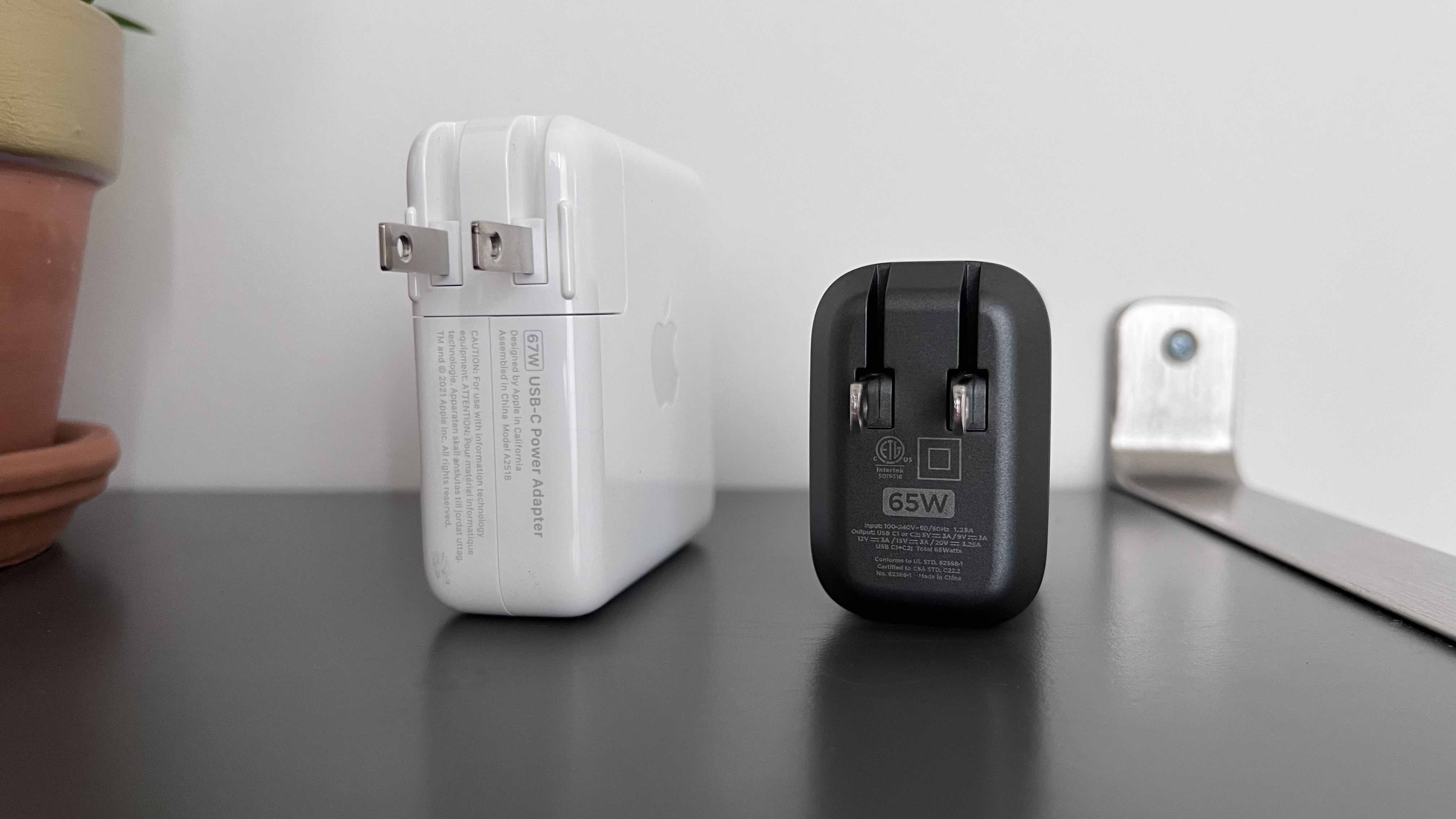 As shown above, the 65W AC Adapter has an AirPods Pro case footprint (although it is thicker). And here’s how much smaller it is than Apple’s single-port 67W power adapter.