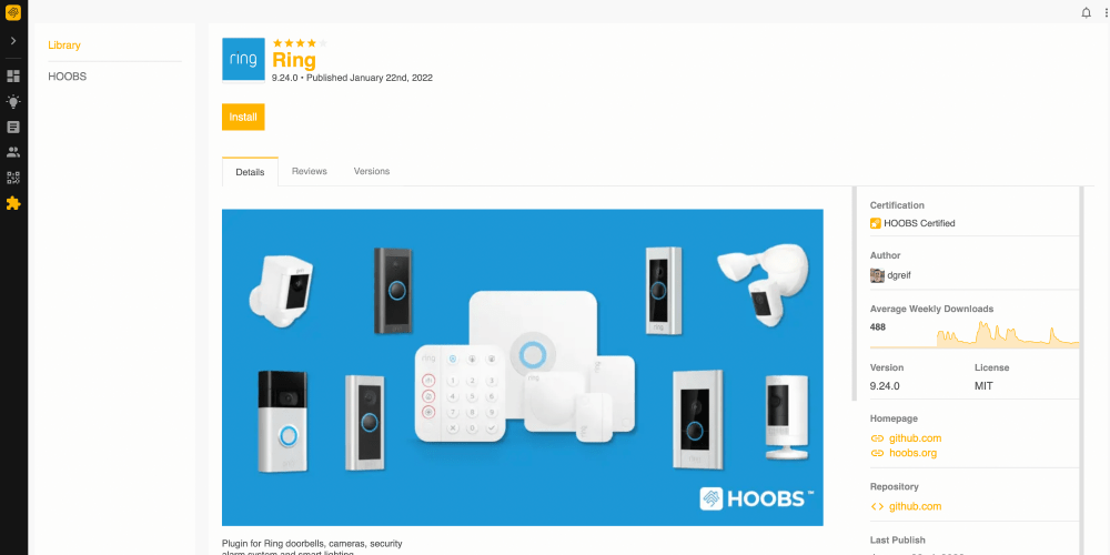 For this article, I am going to assume your Ring devices are already up and running and on your network. Go to the plugin library in the HOOBs web interface and look for the Ring plugin. HOOBs has it listed as a certified plugin, so you’ll enjoy a simple setup experience. In fact, the process was so easy, that I was even unsure what to do next.