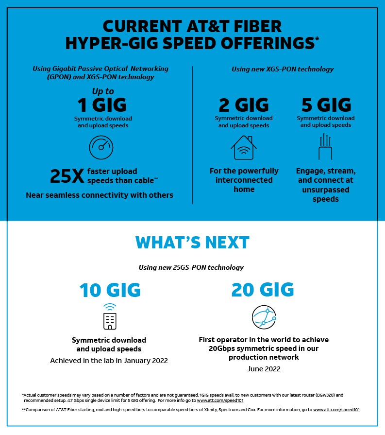 AT&T says it’s “laser-focused” on being the “best broadband provider in America.” In an update on its progress for faster speeds, improved capacity, and lower latency, the company shared it hit the massive 20 Gbps download and upload speeds with its production network following the milestone of hitting 10 Gbps earlier this year.