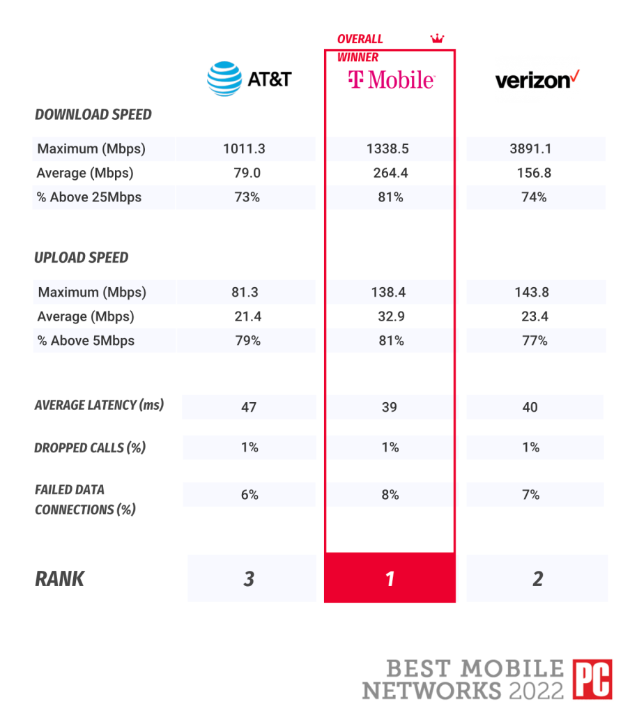 Every year, PCMag does a pretty impressive and in-depth test to crown the Best Mobile Network for consumers. This year, testers drove 10,000 miles across the country to get a full picture of the current state of T-Mobile, Verizon, and AT&T networks. The results show that T-Mobile is continuing to out-perform AT&T and Verizon thanks to its combination of download and upload speeds as well as reliability.