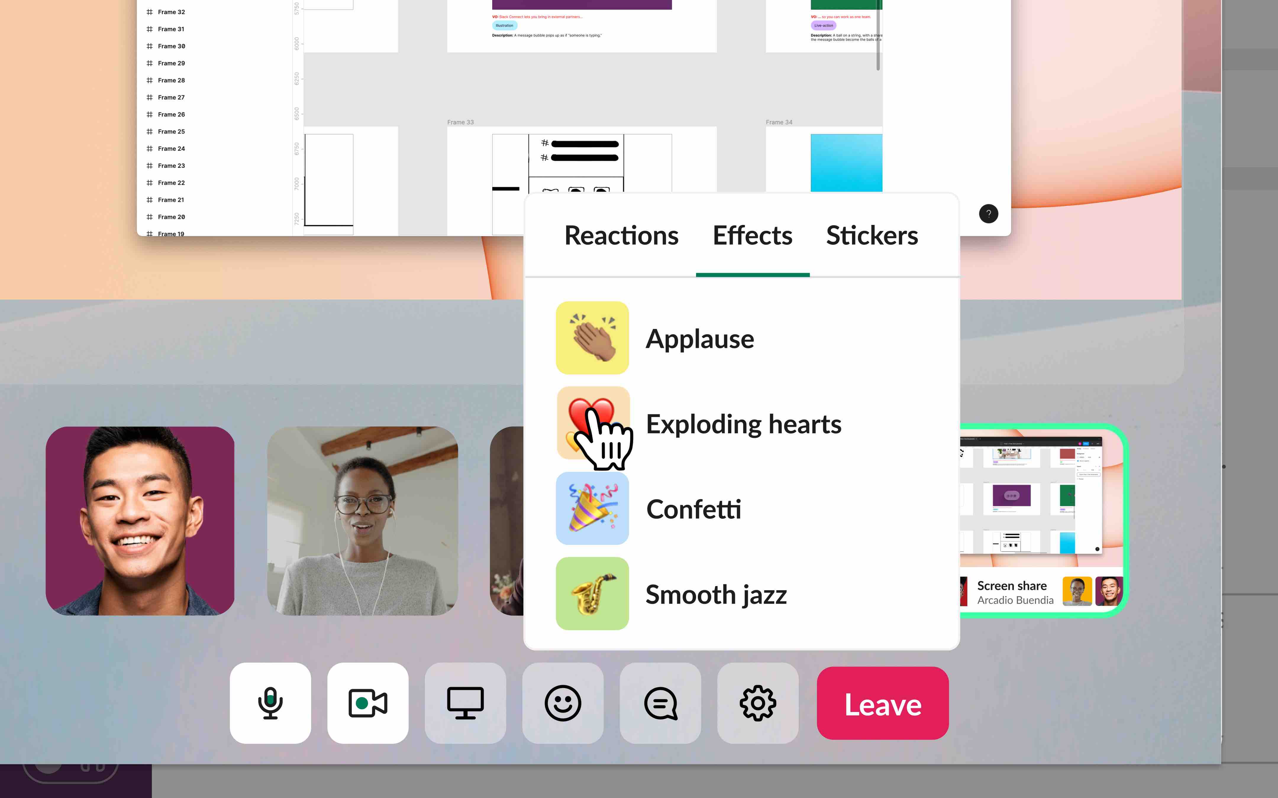 As shown in the top image, Slack is bringing the ability for multiple people to screen share simultaneously. And another handy upgrade will be reactions with emoji, effects, and stickers to “contribute without interrupting the flow of the conversation.”