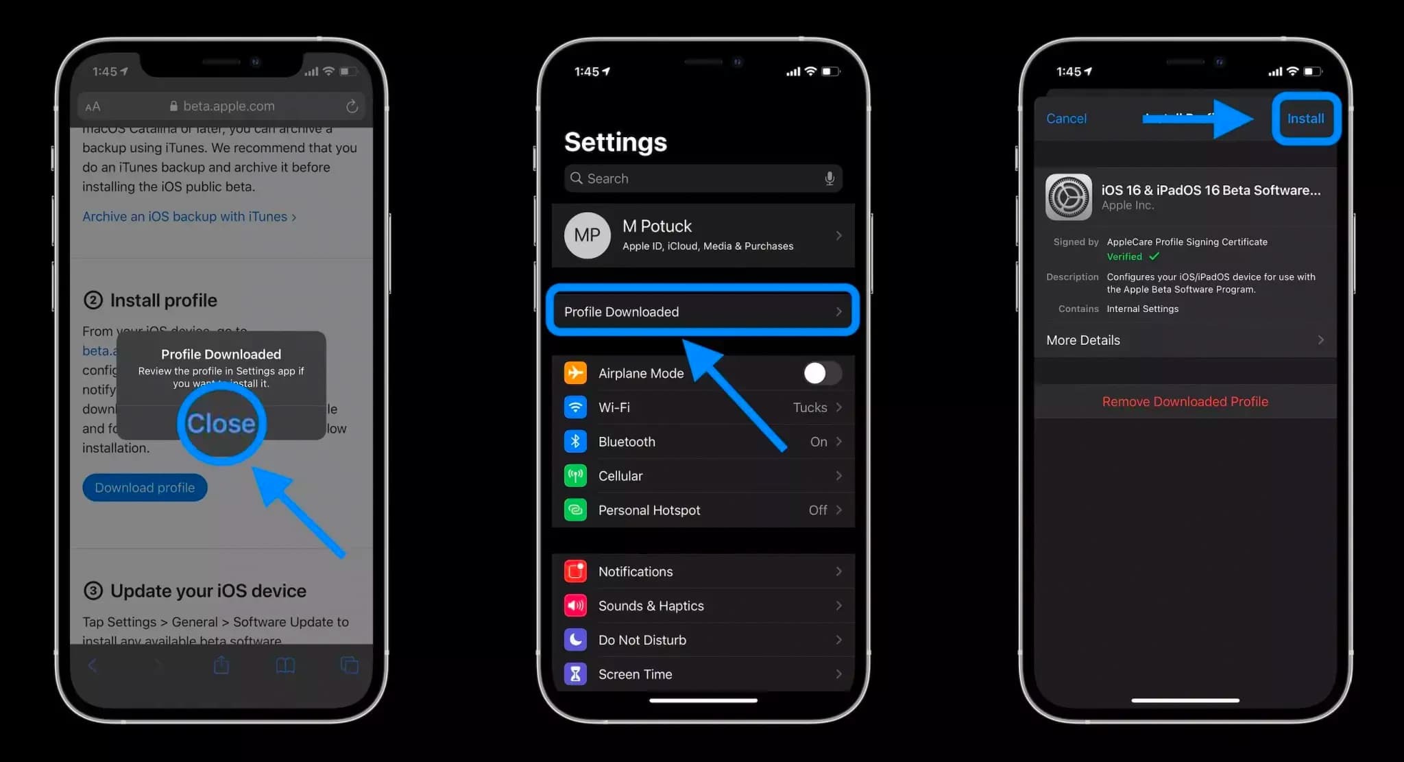- Swipe down and tap Install Profile next to the iOS 16 beta or iPadOS 16 beta