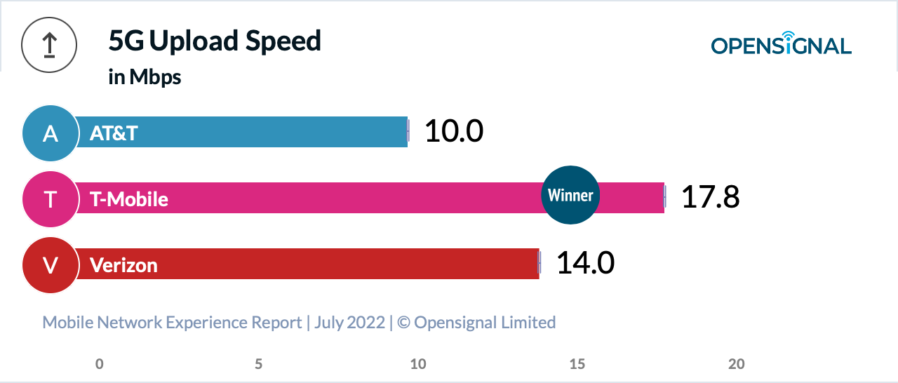 T-Mobile still leads with average 5G upload speeds of 17.8 Mbps, Verizon follows with 14, and AT&T is in third with 10 Mbps.