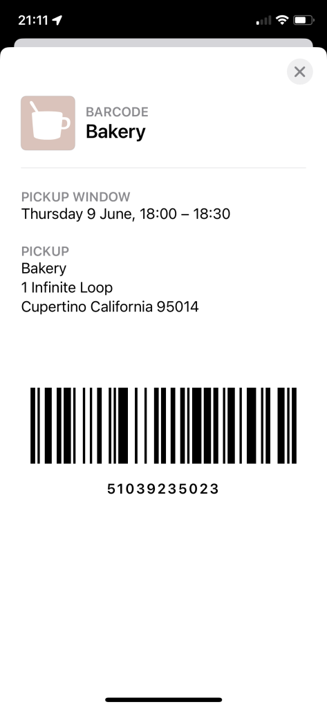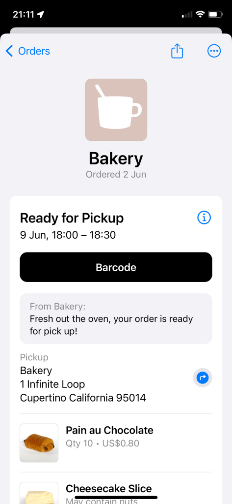 The example bakery order incorporates a button to view a scannable barcode to present at pickup as well as the address of the bakery with a one-tap action to navigate to that address in Maps.