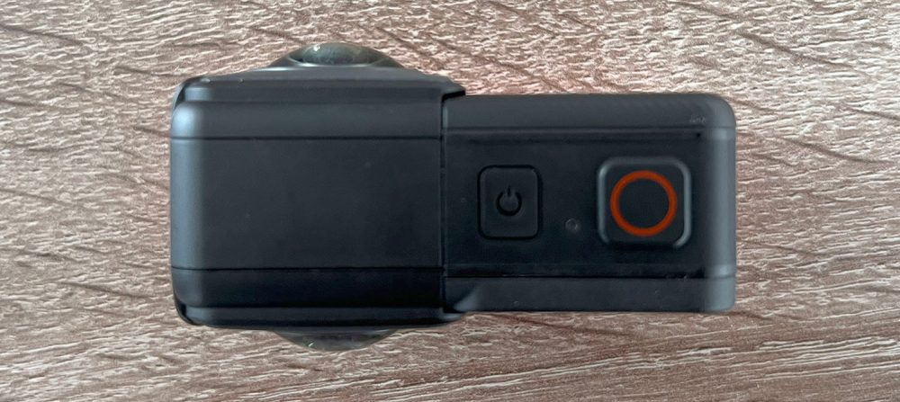With the 4K standard lens attached in the forward-facing position, the ONE RS looks fairly similar to a GoPro. The main distinguishing feature is the bright red battery base. Here you can see it with the 360-degree module alongside: