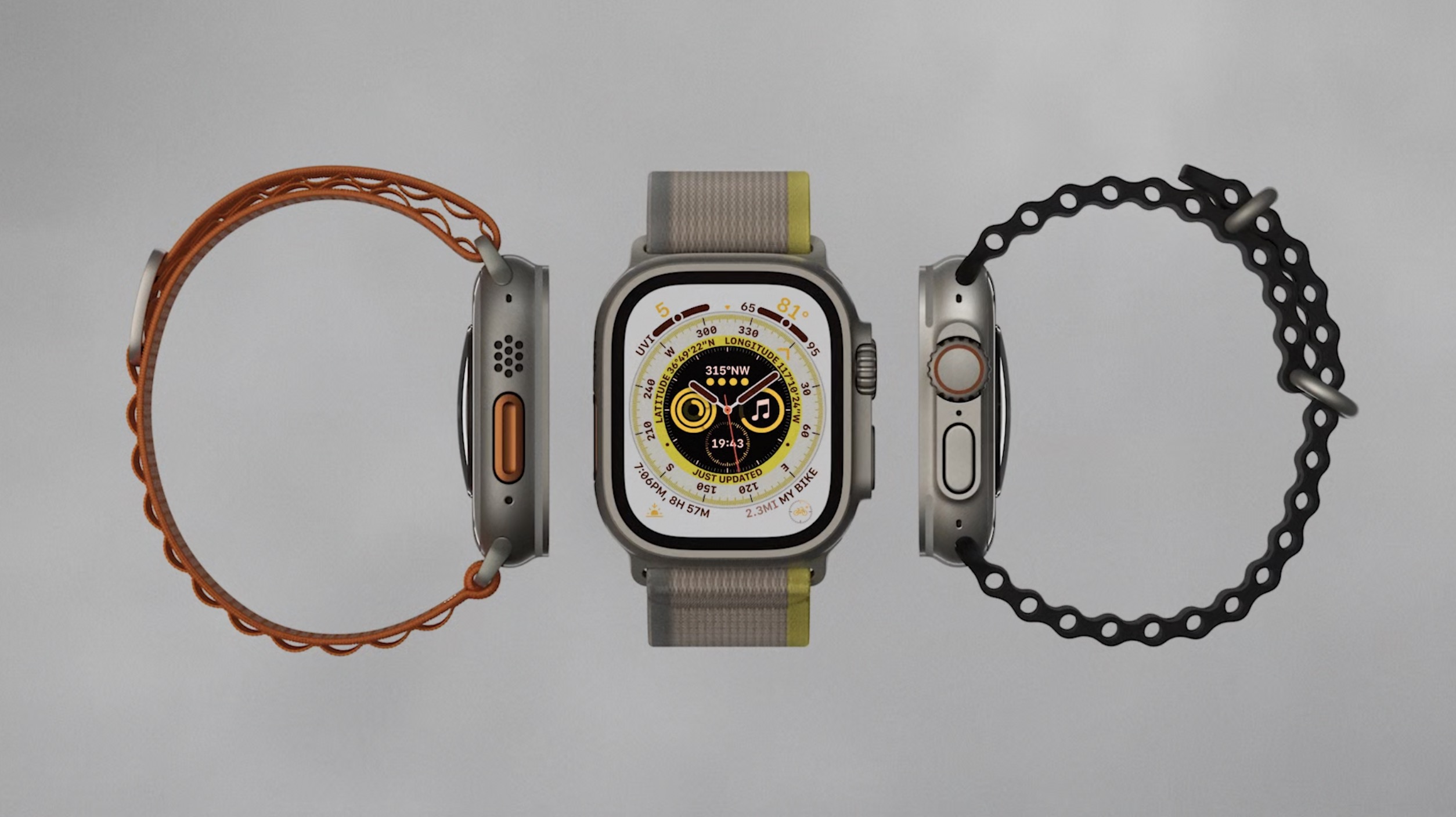 • Now we’re on to the Apple Watch Ultra. Not Pro! Ultra! Rugged and capable. Aero-space grade titanium. Flat sapphire crystal display for durability, 49mm case.