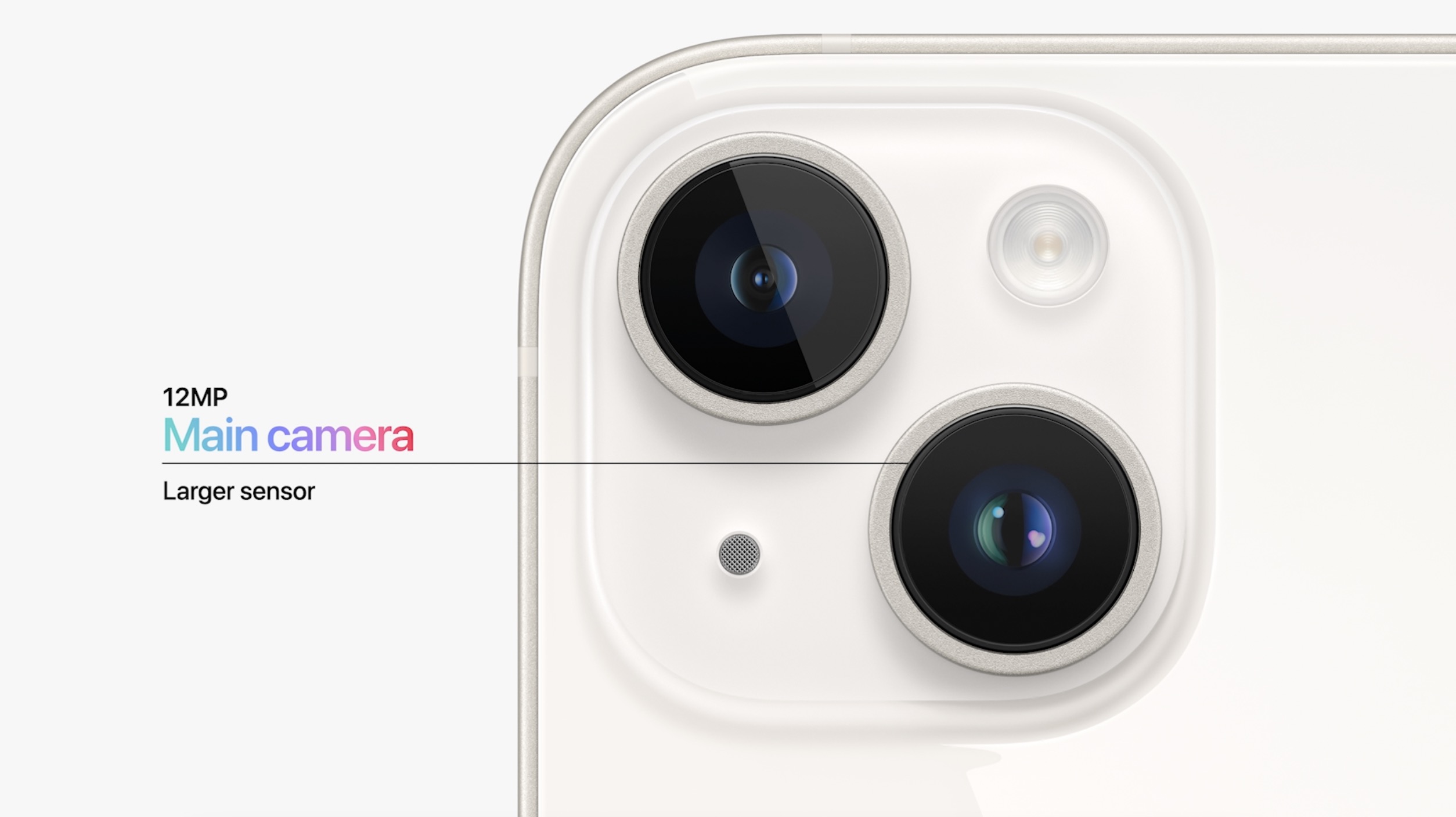 The iPhone 14 and iPhone 14 Plus feature a new dual camera system. The main 12-megapixel camera features a new larger sensor to take in more light and thereby produce better images with more detail and less grain, especially in low light environments.