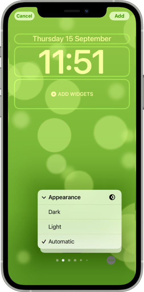 When you customize the Bubbles wallpaper, an Appearance menu allows you to choose whether it should display in always light mode, always dark mode, or automatic based on the system theme.