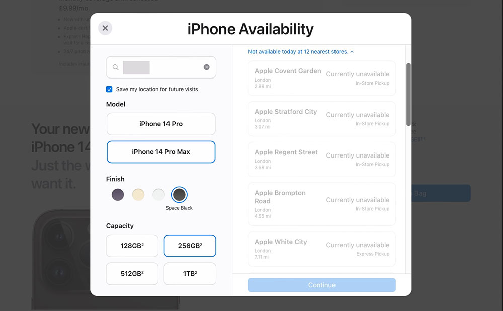 The reality appears to be rather different, with a sampling of stores in different countries showing no in-store pickup availability for any of the iPhone 14 Pro configurations I tried. Some stock will be reserved for walk-ins, but while I’ll be taking a shot at this, I’m not optimistic.