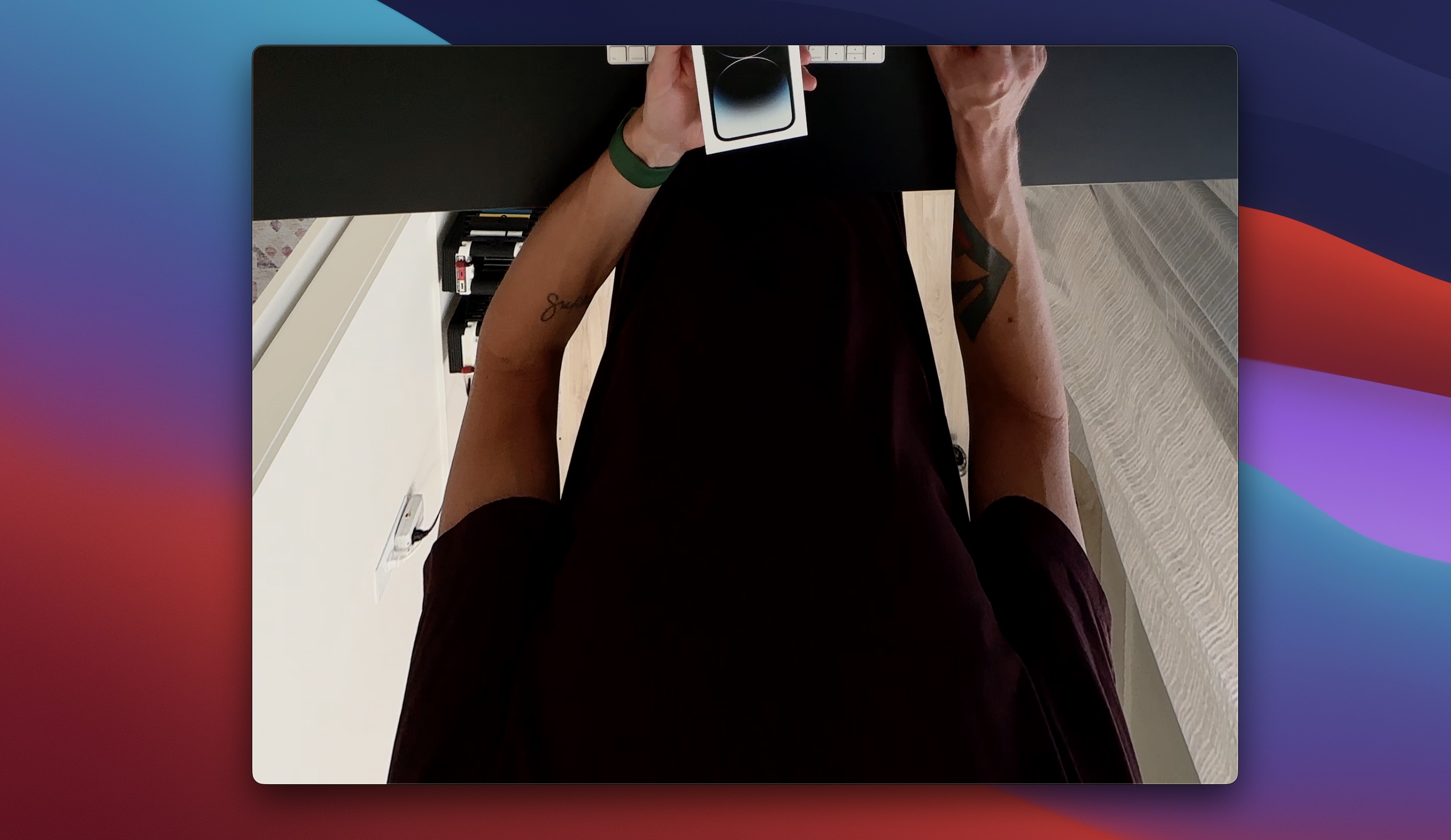 Here’s how Apple’s Continuity Camera with iPhone looks in Desk View (iPhone mounted just above my monitor). Yeah… not really useable unless I readjust how the iPhone is mounted.
