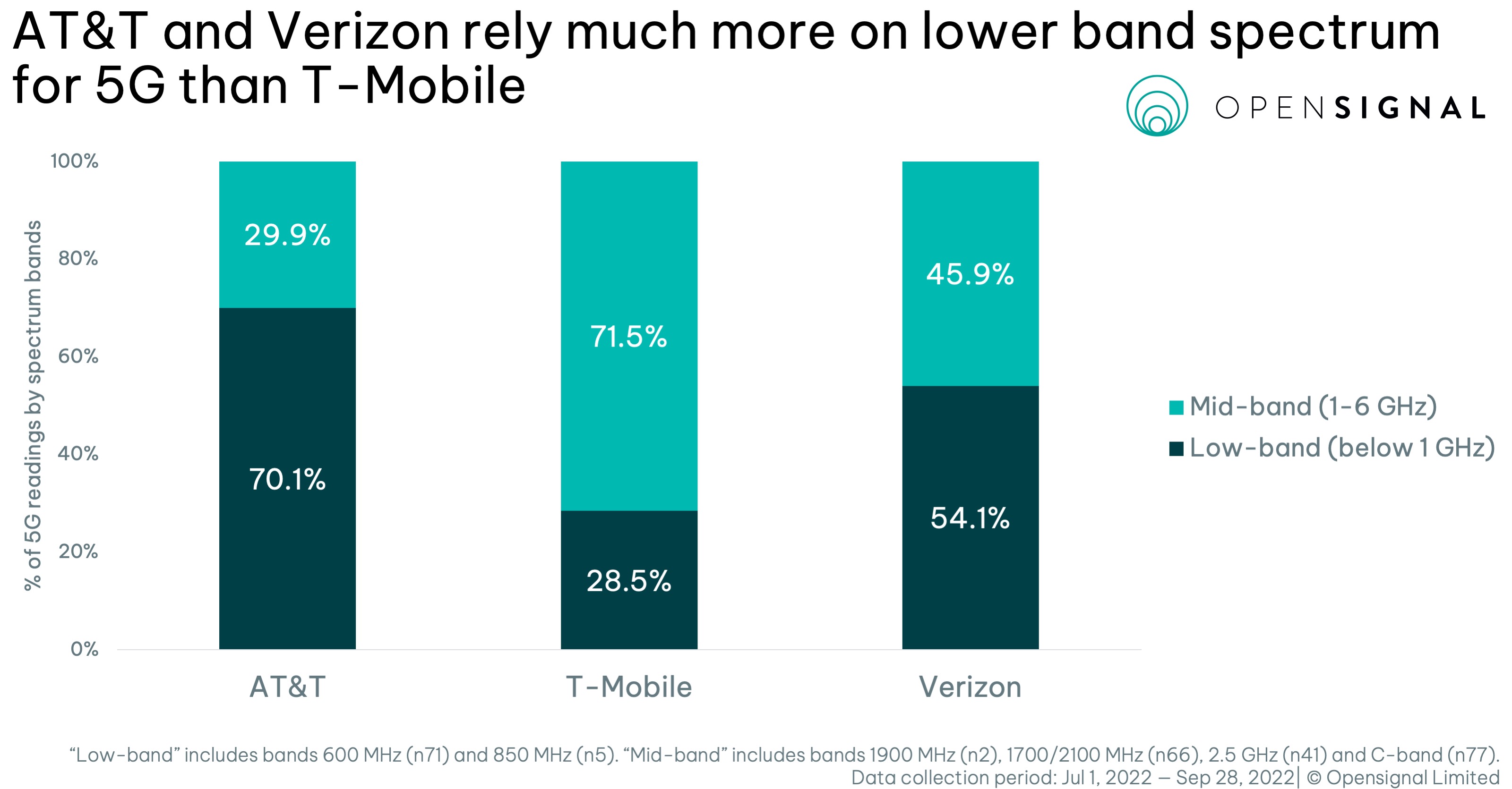 While AT&T and Verizon have made progress, they are still heavily reliant on the slower low-bands than T-Mobile.