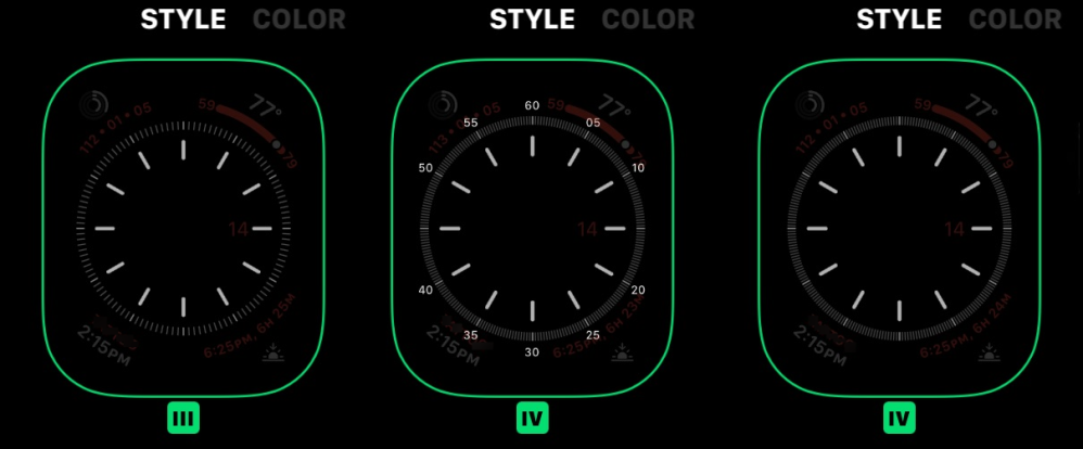 In watchOS 9, the numerals in style IV briefly show in the watch face editor before disappearing because rich complications do not accommodate them. Style IV can only be presented as originally designed when no complications are present. The solution prior to watchOS 9 was to include numerals 10, 20, 40, and 50 in style IV.