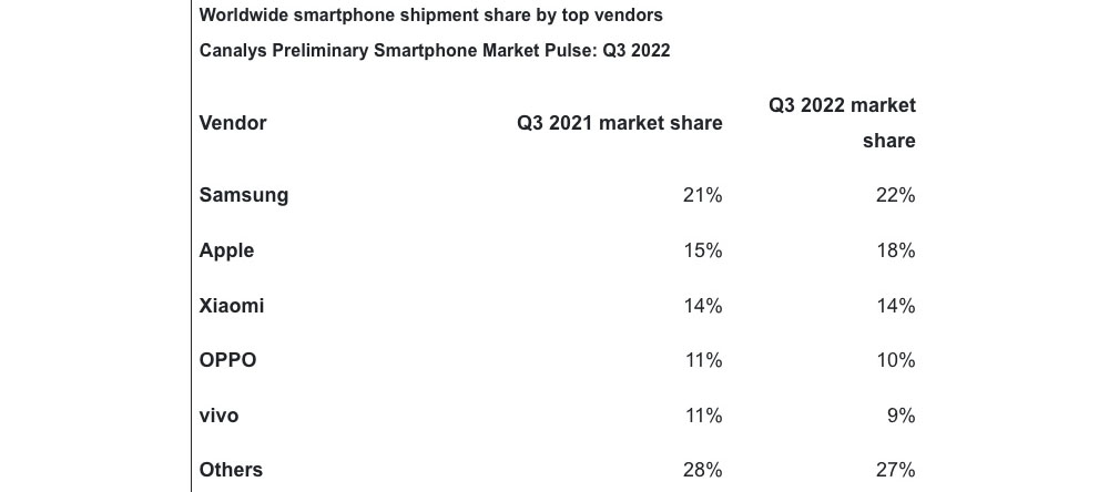 Apple was the only vendor in the top five to record positive growth, improving its market position further with an 18% share during the market downturn thanks to relatively resilient demand for iPhones.