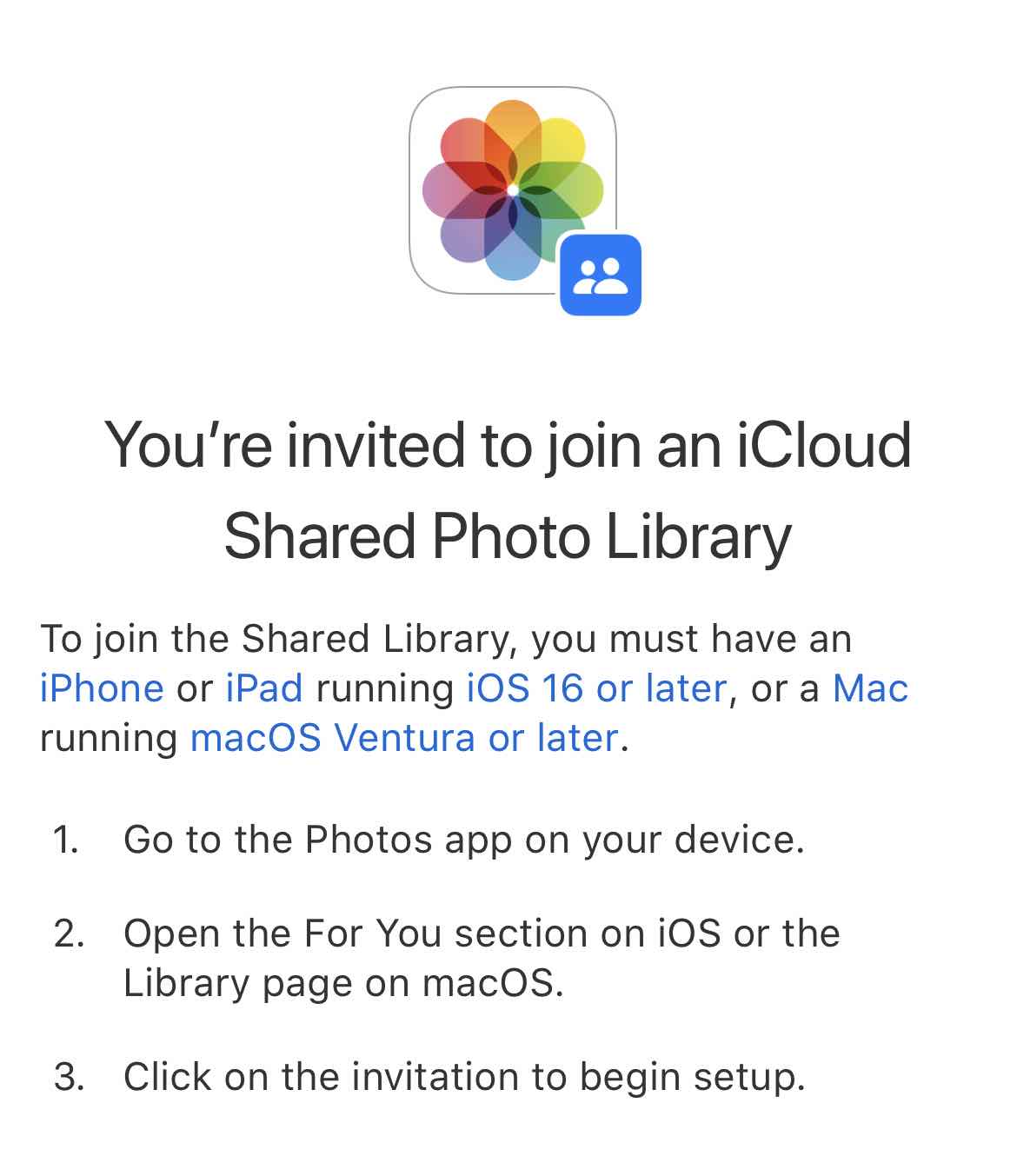 If you invite someone to a Shared Library who isn’t on iOS 16.1, they’ll see a message to upgrade their software: