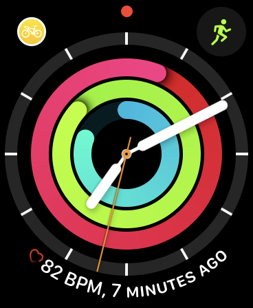 I’ve set Activity as one of my complications, of course, but I’ve set Activity as a second watch face, so that I can swipe across to that periodically during the day. I also have Cyclemeter and Workout as complications on that face to give instant access to them.