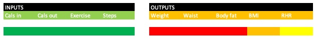 This shows that I hit all my behavioral goals; that my weight, waist size, and body fat percentage all put me on the naughty-step; my BMI makes me overweight but not obese; and my resting heart-rate is in the ‘good’ range. My goal is to turn all of the output cells green.