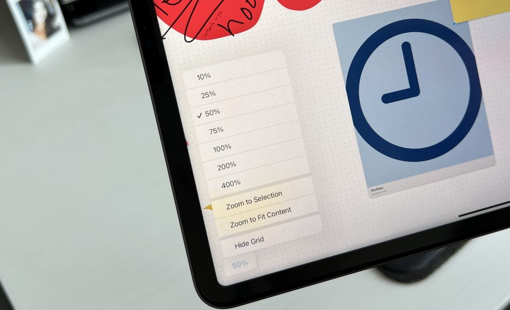 In my walkthrough video, I do mention this idea of an “infinite canvas.” This is one of my favorite features of Freeform, but just to be clear its technically not infinite; the scaling goes from 10% all the way to 400% (so you have a LOT of room to work with). To change the scaling, you can either pinch to zoom in and out with two fingers or use the scaling tool on the bottom left of your board. Images below are showing the 10% scaling and then 400%, as well. You can see that you can get very granular with these scaling options