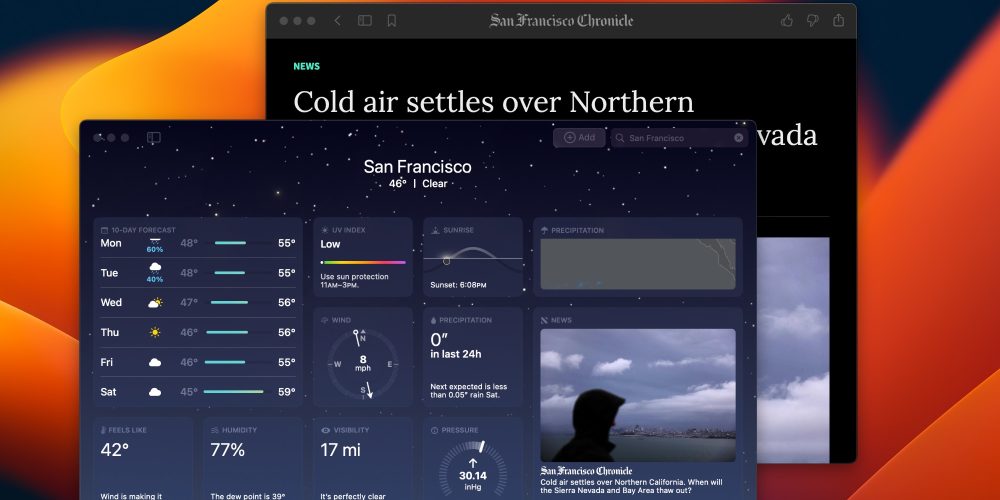 For example, users will find a link for a San Francisco Chronicle article about Bay Area weather conditions as a new data point for San Francisco’s weather. Tapping the link to the Chronicle story opens the article in Apple News. Similarly, the Weather app for cities in Alabama and Mississippi includes a link to a Fox Weather story in Apple News about tornado touchdowns over the weekend.