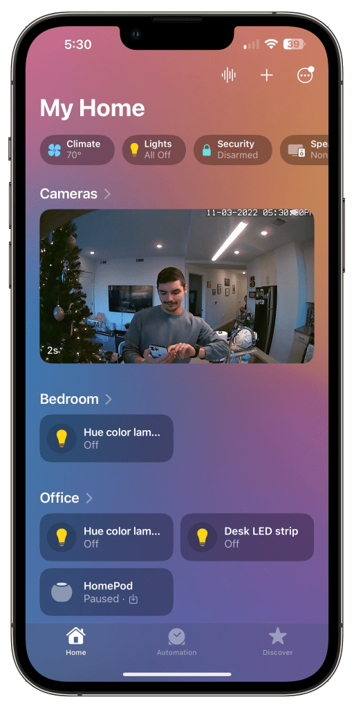 - Users can check their camera’s live feed on the Home app as well as organize and view their devices by room to make keeping track of each activity easy.