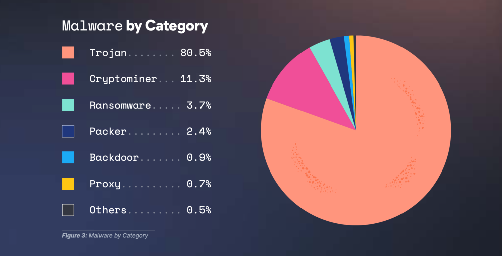 And when looking at the big picture across all the malware it found in all operating systems, trojans were the most commonly used at 80.5% with cryptominers coming in second at 11.3%.
