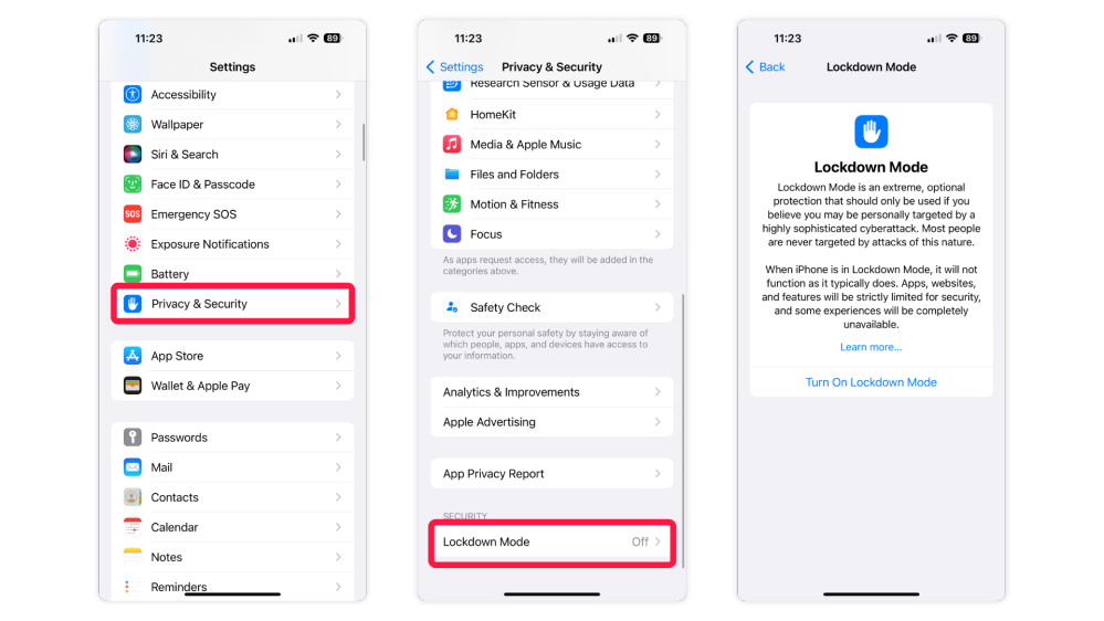 A feature initially created in response to spyware like NSO’s Pegasus, Lockdown Mode offers an extreme level of additional protection to device owners that may be at risk from highly sophisticated cyber attacks – such as journalists, politicians, activists, and government officials. It works by limiting the most-abused device features, like Messages and web browsing, to make it far more difficult for malware to break through.