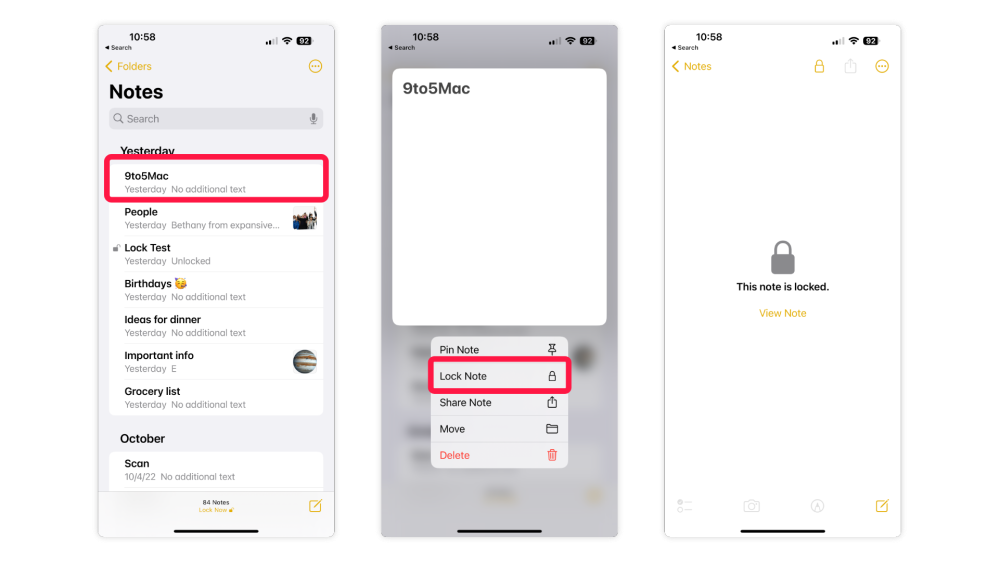 There’s more than one way to secure a note, but the quickest way is to hold down on it from inside a folder, hit Lock Note, and voilà.