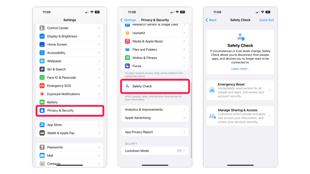 “If your personal safety is at risk, you can use Safety Check on iPhone (running iOS 16 or later) to quickly stop sharing your information or to review and update sharing with individual people and apps.”