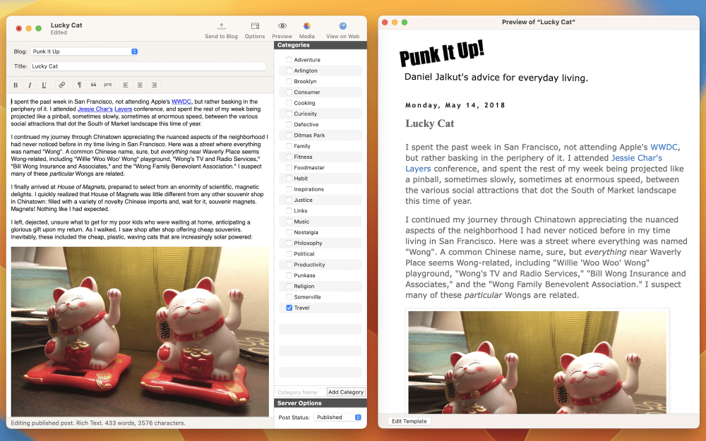 If you’re like me and match keyboard shortcuts to rich text formatting for hyperlinking and stylizing, MarsEdit 5 has something for you as well. It’s an under-the-hood jump to “WebKit2” that shouldn’t change day-to-day usage. However, this change to how rich text formatting works behind-the-scenes is an investment in the future of MarsEdit and how the app adopts modern technologies. Jalkut explains for the non-developers like me on the MarsEdit 5 launch blog post. It’s something you appreciate more when you follow the development of MarsEdit and Micro.blog on Daniel Jalkut’s and Manton Reece’s Core Intuition podcast.
