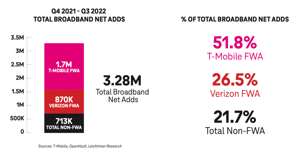 “Over the last year, most of the broadband industry’s net additions have come from fixed wireless, with T-Mobile leading the way. In Q3 alone, fixed wireless added 920K new subscribers, while top cable companies added roughly 40K subscribers.”