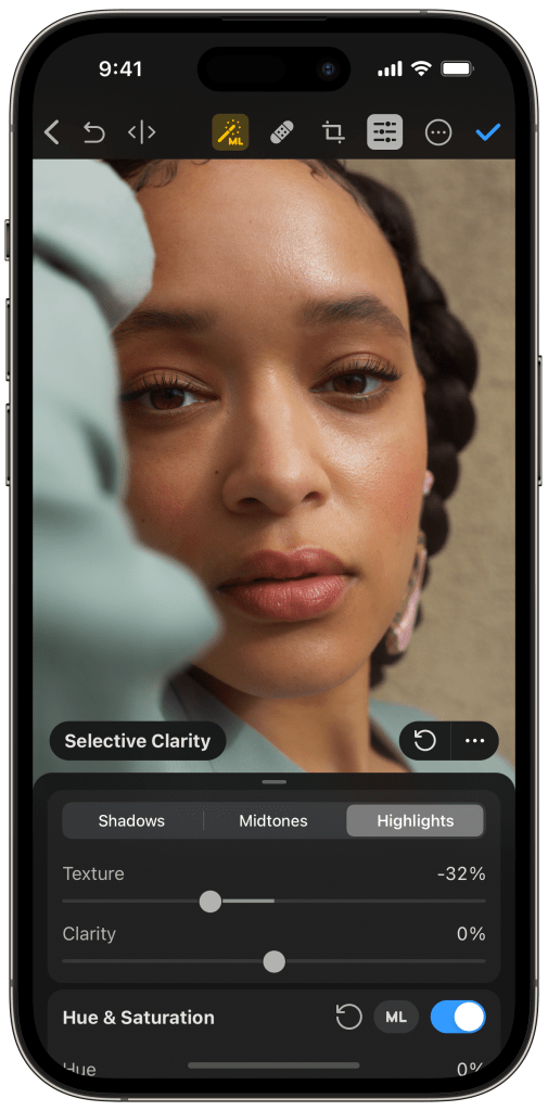 The app uses ‘texture-aware’ algorithms to help optimize for clarity. The tools palette exposes two simple sliders, one for Clarity and one for Texture. Drag the sliders to increase the intensity of the algorithmic effect being applied to the image.