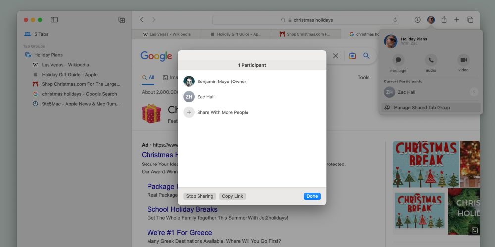 If you want to go beyond a static list of links, Shared Tab Groups is the answer. A normal tab group syncs across all your personal devices with iCloud. A Shared Tab Group extends that concept. A shared tab group extends that by making those same tabs also available to other people, like your friends or work colleagues or whoever you choose to invite.