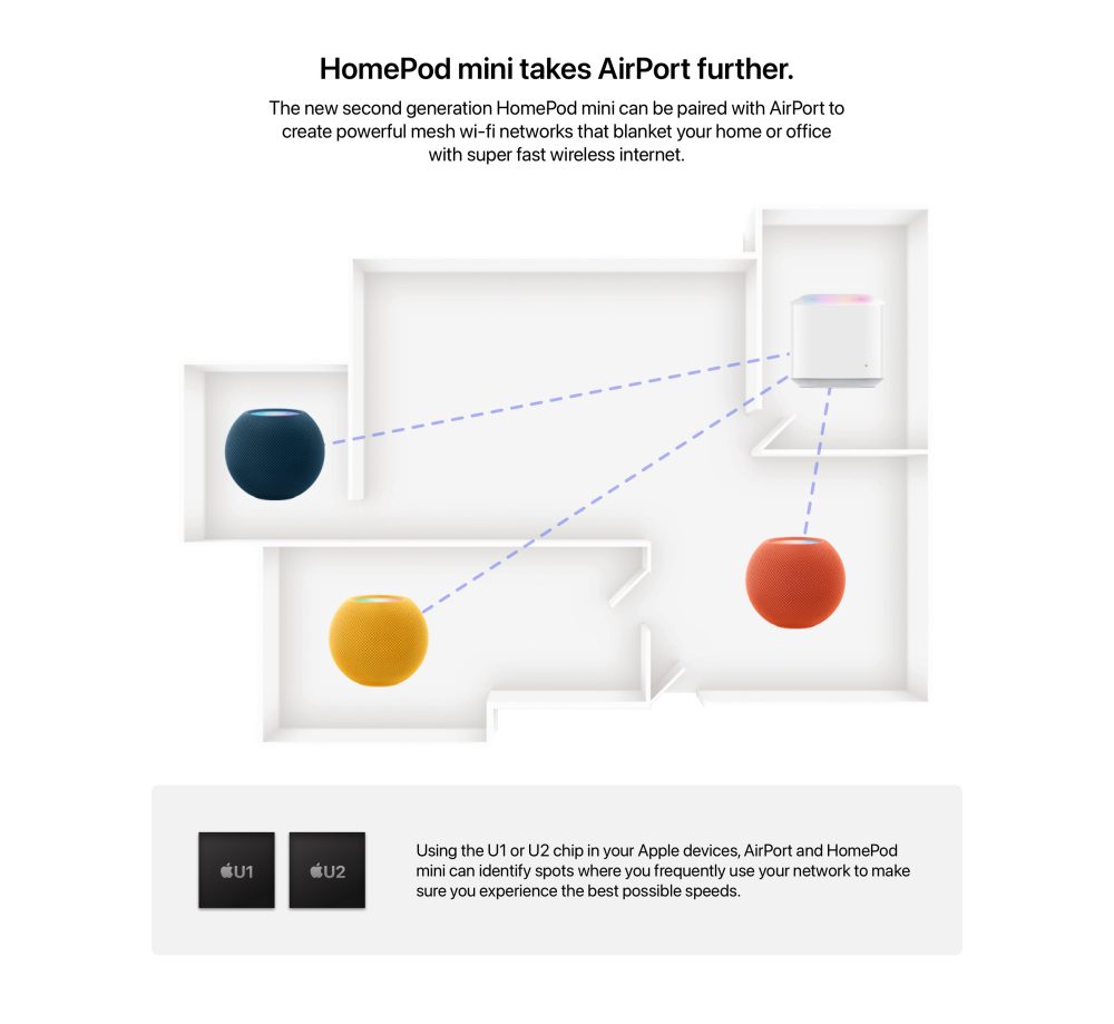 The idea for the mesh network is that using the new A15-powered AirPort, Apple could use the U1 and U2 chips in current Apple devices to create a mesh network that runs off of HomePods in your home network. This would be ideal if you live in a larger house that has a second floor and a basement, or if you live in a place with thick concrete walls where Wi-Fi signals begin to dampen. One question I have would be the range of the router as well as each HomePod mesh point. It would also be nice if Apple started making HomePods that included an Ethernet jack just in case someone wanted to wire into the mesh network. But overall this seems like a no-brainer; it would get expensive if you didn’t need HomePods and just wanted mesh points, but maybe Apple will create simple mesh points that are sold at a cheaper price than the $99 HomePod Mini.